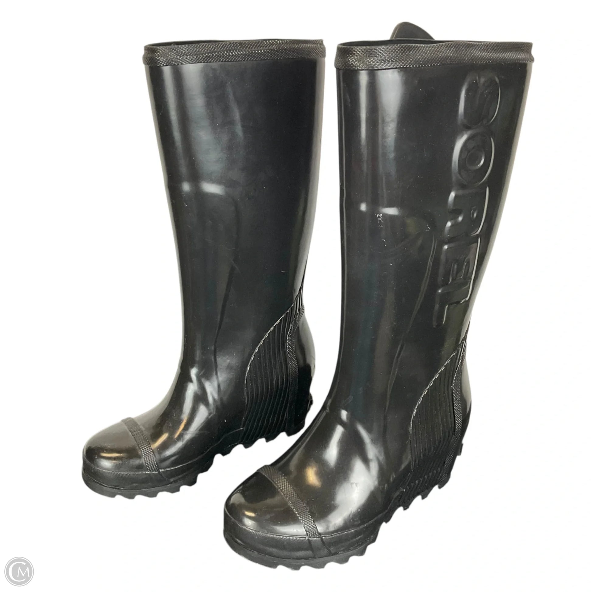 Step out in sleek sophistication with Sorel's black rain boots in size 8, a blend of style and function.